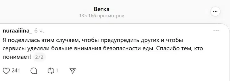 Она приложила скрины переписки с оператором доставки еды. Казахстанка отметила, что сильно порезала рот из-за стекла, и потребовала наказать заведение. В ответ оператор оформил ей возврат суммы за донер и пообещал наказать заведение штрафом после разбирательства.