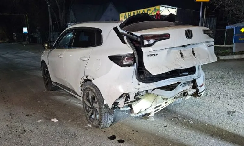 От жесткого удара автомобиль Changan CS отбросило более чем на 10 м вперед.