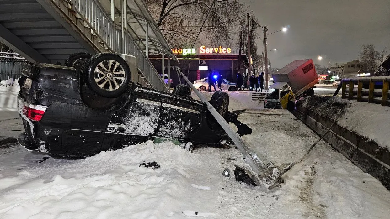 Ночное ДТП в Алматы: внедорожник снес столб и перевернулся