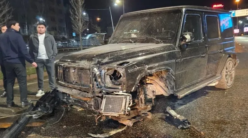 После авто перебросило через бордюр на разделительную аллею, где на полном ходу машина начала сносить молодые деревья. Движение гелендвагена на разделительной аллее напоминало проезд по рельсам. В таком виде машина неслась около 50 м.