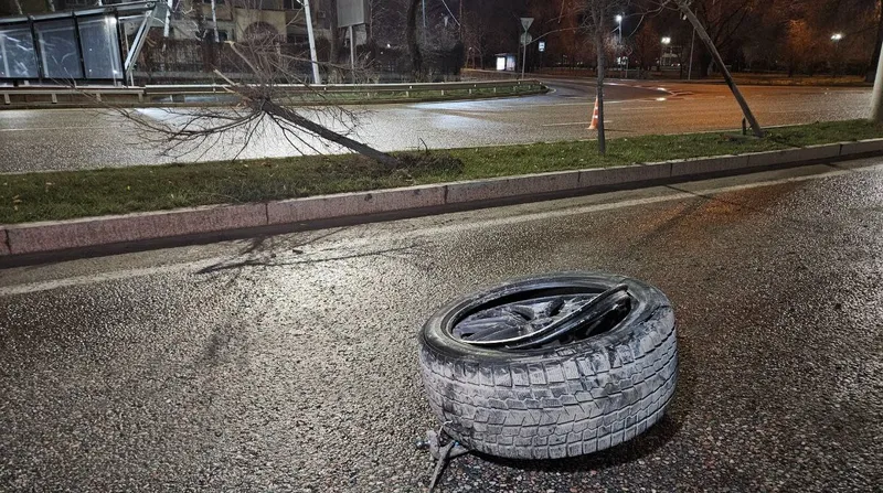 Затем авто снова занесло на встречную полосу. В ходе движения у машины отлетело переднее колесо. По счастливой случайности отсутствие на дороге машин позволило избежать лобового столкновения.