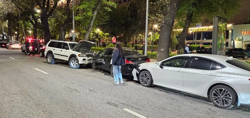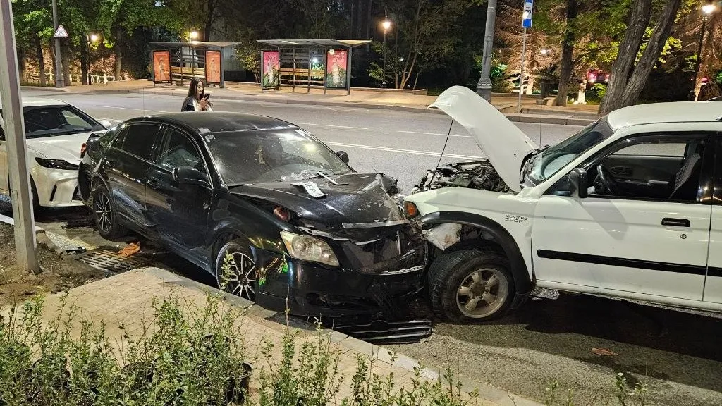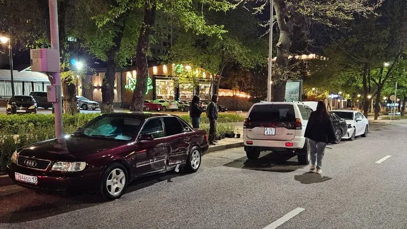 Автомобиль Mitsubishi Montero двигался по пр. Достык в северном направлении. Ниже ул. Жолдасбекова на изгибе дороги он проехал полосу встречного движения. По счастливой случайности у него не оказалось встречных автомобилей, но он начал "собирать" припаркованные у обочины автомобили.