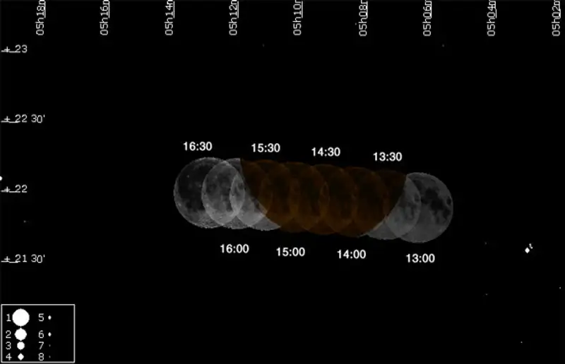 В момент максимального затмения Луна будет находиться в зените для наблюдателей в Тихом океане около о. Гуам и Северных Марианских островов. Теневая фаза составит 1.1061, а центр Луны пройдет в 21.4 угловых минутах от оси земной тени. Северный край лунного диска будет находиться в 6.4 угловых минутах от оси тени и в 33.3 угловых минутах от ее края. С другой стороны, южный край лунного диска будет отстоять на 36.5 угловых минут от центра тени и на 3.2 угловых минут от южного края тени. Таким образом, северный край Луны должен выглядеть намного темнее южного, так как он будет находиться глубже в земной тени.