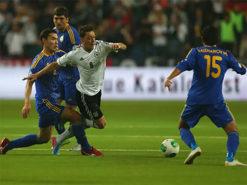 Стартовый состав казахстанской дружины не вызвал сомнения, в обороне сидеть команда не собирается... С первых минут мячом завладели немцы, а минуте на пятой Марио Гетце обошел нескольких соперников, ворвался в штрафную, далековато отпустив мяч, прямо в руки Андрею Сидельникову, следом прорыв слева и удар низом мимо ворот от Юлиана Дракслера. Опасно с линии штрафной пробивал Эзил, вот только Виктор Дмитренко лег под удар, в следующем моменте два в одного вышли немцы, удар Гетце оказался на радость хозяев очень неточным, намного выше ворот. Навес в штрафную, перепасовка, мяч у Швайнштайгера, немного техники и «круглый» в воротах — 0:1. Прошло две минуты и снова атака гостей, неразбериха в защитных порядках, мяч откатился к Гетце, который не упустил возможность поразить пустые ворота — 0:2. Игра пошла поспокойнее, вот только на руку подопечным Беранека это не пошло, хозяева так и не смогли даже ударить в створ ворот Мануэля Нойера.