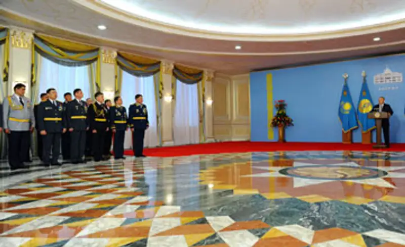 - Вы все отличились своим самоотверженным трудом и безупречной службой. Ваша главная задача - обеспечение безопасности народа и государства. Нет более высокой чести, чем защита и почитание нашей Независимости. Обеспечение стабильности и правопорядка в нашей мирной стране напрямую зависит от вас. Вы исполняете свой долг с большим профессионализмом. Стабильность Казахстана и благополучие нашего народа охраняют надежные воины. Для того, чтобы защищать страну необходимы неустанный труд и сильный дух. Думаю, что вы все обладаете этими качествами. Неся службу в соответствующих подразделениях Вооруженных сил, правоохранительных органов и специальных служб, вы заработали столь высокую награду. Уверен, что вы и дальше будете своей службой доказывать преданность Родине, проявляя патриотизм и необходимое умение, - отметил Нурсултан Назарбаев.