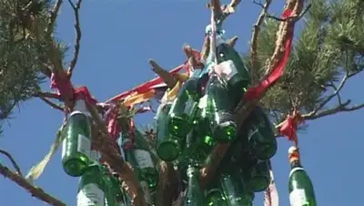 В итоге бутылки гроздьями «украсили» сосны, а их осколки - всю поляну. Иная тара разбивается еще в процессе развешивания, выскальзывая из рук нетрезвых древолазов, и без того с трудом цепляющихся за смолистые и колючие хвойные ветви. Немало бутылок разбивают специально - на счастье. Некоторые срывает ветром с высоких стволов. Конечно, собирать осколки - не царское, то бишь не свадебное дело. А потому новобрачные, похрустев по чужим и своим осколкам, беззаботно отправляются на банкет. После них к соснам прибывает следующая пара новобрачных, за ней - другая... Каждая оставляет свой бутылочный след.