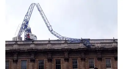 Штормовой ветер повалил строительный кран на крышу здания на улице