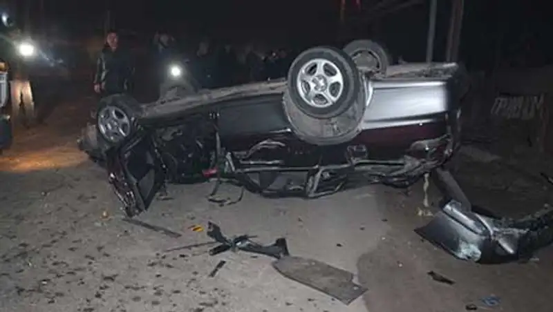 В Алматы после столкновения с Мерседесом Субару врезался в столб и перевернулся (фото)