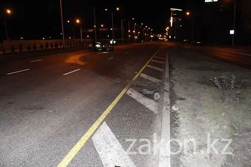 Водитель Тойоты ехал вверх по пр. Сейфуллина. На повороте на пр. аль-Фараби не справился с управлением и вылетел через разделительный газон. Машина развернулась на 180 градусов и остановилась поперек дороги.