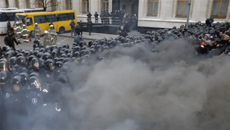 Столкновения между протестующими и бойцами спецподразделения «Беркут» произошли в воскресенье у здания администрации президента на Банковой улице. Со стороны «беркутовцев» в ход шли дубинки, в ответ в них летели камни. Ранее сообщалось, что в итоге более сотни милиционеров и свыше 50 активистов обратились за медицинской помощью.