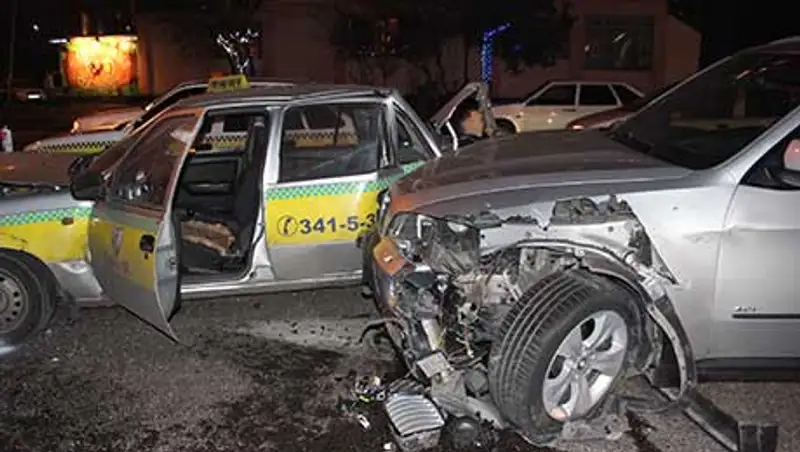 Водитель БМВ х5 ехал по пр. Абая в восточном направлении. Перед перекрестком он врезался сзади в Мерседес и после удара БМВ отбросило в стоявшую на «красный» Дэу Нексию. Нексия по инерции отлетела вперед в Тойоту. Тойота также по инерции проехала вперед и столкнулась с автомобилем, водитель которого через какое-то время после ДТП уехал, судя по всему, из-за незначительных повреждений его машины.