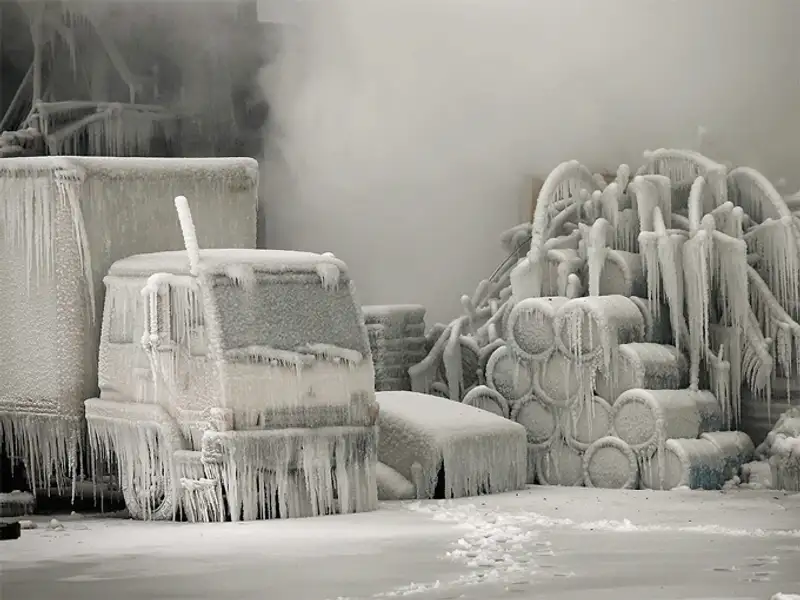 А рекордно низкая температура сразу же превратила последствия пожара в волшебный ледяной «замок».
