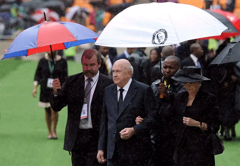 Бывший президент ЮАР Фредерик Виллем де Клерк во время панихиды по бывшему президенту ЮАР Нельсону Манделе на стадионе «Соккер Сити» в Йоханнесбурге