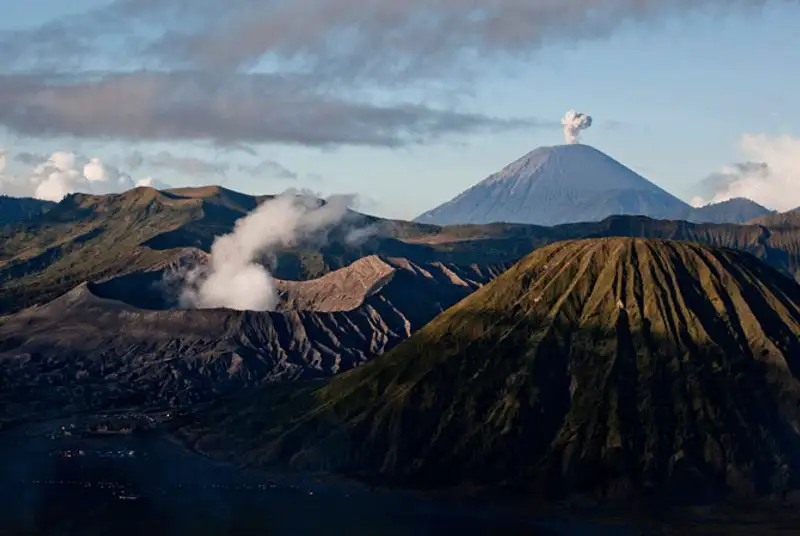 Извержение вулкана Бромо в Индонезии, 23 июля 2013. Является одним из наиболее популярных туристических достопримечательностей в Восточной Яве в силу своей доступности. Кратер Бромо диаметром 600 метров, вулкан находится в состоянии постоянной активности последние 20 лет.