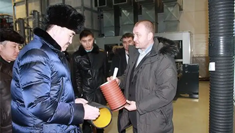 Посетил градоначальник и ряд предприятий поддержанных государством в рамках программы форсированного индустриально-инновационного развития. Одно из таких ТОО «Казпласт», компания производит крупногабаритные полиэтиленовые изделия. В прошлом году здесь запустили линию по производству гофрированных двухслойных полипропиленовых труб для наружной канализации. Мейраму Смагулову показали и единственную в Караганде испытательную лабораторию. После того как лабораторию аттестуют и сертифицируют здесь будет производиться контрольная проверка продукции. В случае соответствия норме всех параметров выдается документ, подтверждающий качество и только затем трубы отправятся потребителю.