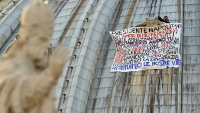 Ди Финицио развернул большой плакат, на котором, в частности, было написано «Помоги нам, папа Франциск», «Президент Наполитано, ради бога, прекратите, вы нас убиваете» и «Верните нам наши жизни». Полиция убедила ди Финицио завершить акцию. По данным издания, активист поранил ногу и просил передать ему на крышу средства дезинфекции и бинт, но, по-видимому, помощь он получил уже на земле.