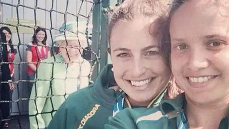 Королева, прибывшая посмотреть матч по хоккею на траве, случайно появилась на заднем плане снимка спортсменок из Австралии, Джейд Тейлор (Jayde Taylor) и Брук Перис (Brooke Peris). Поняв, что попала в кадр, ее величество не попыталась отойти, а, напротив, стала улыбаться в камеру смартфона.