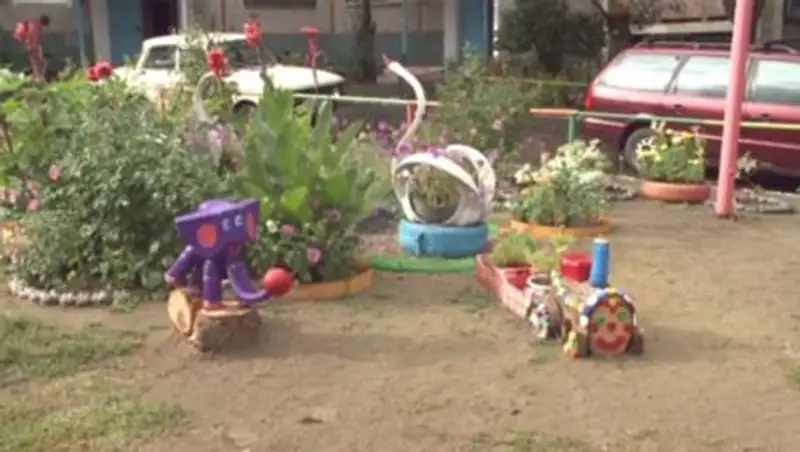 Они созданы жителями дома из ненужных бутылок, крышек, банок и автомобильных шин.