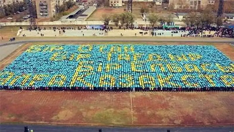 6 600 участников. Аксусцы решили побить этот рекорд, собрав почти вдвое больше людей. На центральном стадионе жители города энергетиков и металлургов выстрои-ли патриотическую надпись "Бір Отан, Бір Тагдыр, Бір Елбасы! Алга, Казакстан!" при помощи желтых и голубых плакатов, которые держали в руках. – Официально заявляю, что новый рекорд установлен, с чем я и поздравляю жителей Аксу, – говорит генеральный арбитр российского комитета по регистрации рекордов планеты Вадим Горюнов. – По нашим подсчетам, участие в акции приняли 10 800 человек, такое раньше не удавалось никому. Мы вручили сертификаты организаторам и кубок, который передали в местный музей.