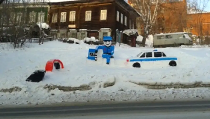 На одной из городских улиц неизвестные соорудили и раскрасили фигуру улыбающегося автоинспектора, сидящего на стуле рядом со служебным автомобилем. В руках снеговик держит полосатый жезл. Авторы также вылепили знак ограничения скорости до 40 километров в час и камеру для фиксации нарушений правил дорожного движения. Как говорят очевидцы, над композицией трудились 11 человек.