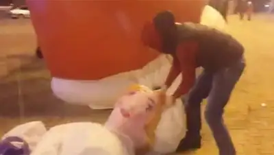В социальной Сети ВКонтакте сегодня утром появилось видео под названием «оживление снегурки))». На нём в течение двух с половиной минут парень сначала пытается перевернуть надувного Деда мороза, отобрать у него посох, а после делает «искусственное дыхание» лежащей рядом Снегурочке. Примечательно, что проходившие мимо люди останавливались и наблюдали за происходящим.