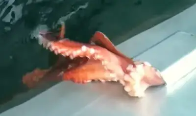 В сеть попало случайно снятое видео, которое демонстрирует невероятный побег осьминога с рыбацкого судна. У него был лишь единственный путь на свободу - через небольшое отверстие в борту корабля, которое во много раз меньше самого осьминога. Однако даже небольшой дырки оказывается достаточно, чтобы существо весьма крупного размера могло вернуться в океан.
