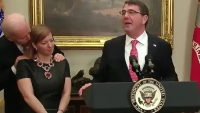 Когда Картер начал благодарить за поддержку, находившийся рядом Байден подозвал к себе Стефани Картер. После того, как она подошла и встала перед ним, вице-президент положил руки ей на плечи, а глава Пентагона продолжил свою речь. Через несколько секунд Байден что-то прошептал смущенной женщине на ухо. Супруга главы военного ведомства кивнула в ответ.