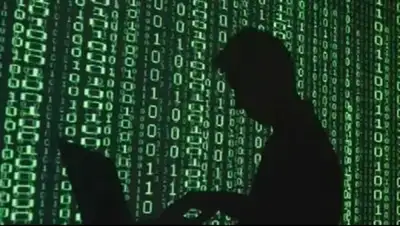 На фоне бегущей заставки, напоминающей кадры из фильма "Матрица", была размещена черная фигура в балахоне с капюшоном.