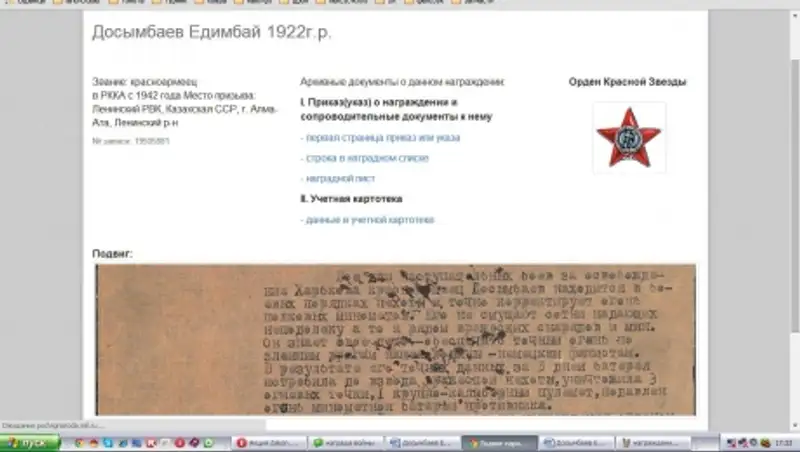 Мой папа был учителем истории в школе и знал о том, что братишка Едымбай пропал без вести на фронте. В прошлом году в общедоступном электронном банке документов «Подвиг Народа в Великой Отечественной войне 1941-1945гг.» на сайте podvignaroda.ru мы нашли документ Награждение от 25.08.1943г. 2-го Украинского фронта, о награждении нашего дяди Орденом «Красная Звезда».