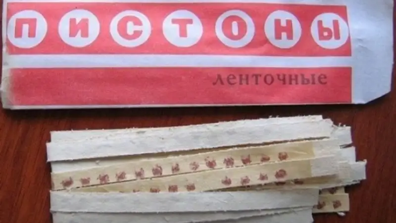 У кого был револьвер, который стрелял такими пистонами? Но интереснее было чиркать по коричневым пятнам чем-то острым и смотреть, как они воспламеняются. Или ещё интереснее: скатать рулон из полоски и шарахнуть по нему молотком. Звон в ушах на 10 минут был обеспечен.
