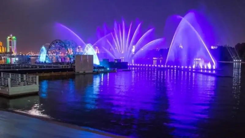 В ходе шоу на водном экране были спроецированы поздравления городу на разных языках, а на водных арках и фонтанах с применением новейших светолазерных технологий были нарисованы знаковые силуэты Астаны.
