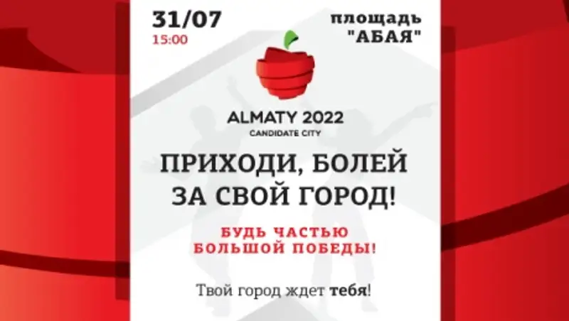31 июля в 15:00 на площади им.Абая перед Дворцом республики состоится прямая трансляция из Куала-Лампура, с сессии Международного Олимпийского Комитета, где будет названа страна-организатор грядущих Олимпийских игр, сообщает Zakon.kz со ссылкой на Управление культуры города Алматы.