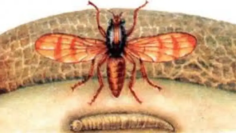 Дынная муха - карантинный вредитель, паразитирующий в плодах семейства тыквенных. Широко распространен в Средиземноморье, на Кавказе и в Азии, в том числе и в Казахстане. Однако местные бахчеводы уверяют, что еще пять лет назад об этих насекомых даже представления не имели. Есть версия, что их завезли с плодами из Каракалпакстана. Одна самка мухи откладывает до 120 яиц. Насекомые очень прожорливы. Есть такую дыню опасно, ими не рекомендуется вскармливать даже скотину. Выявить зараженные плоды на ранних стадиях очень сложно, рассказывают специалисты, потому что спелые и здоровые дыни и арбузы поражаются изнутри. Места проколов мякоти могут служить средой для развития вирусных и грибковых заболеваний.