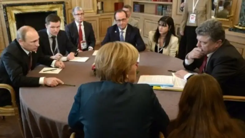 Изначально в переговорах принимали участие только Владимир Путин, Ангела Меркель, Франсуа Олланд и украинский лидер Петр Порошенко, однако вскоре к ним присоединились члены делегаций.