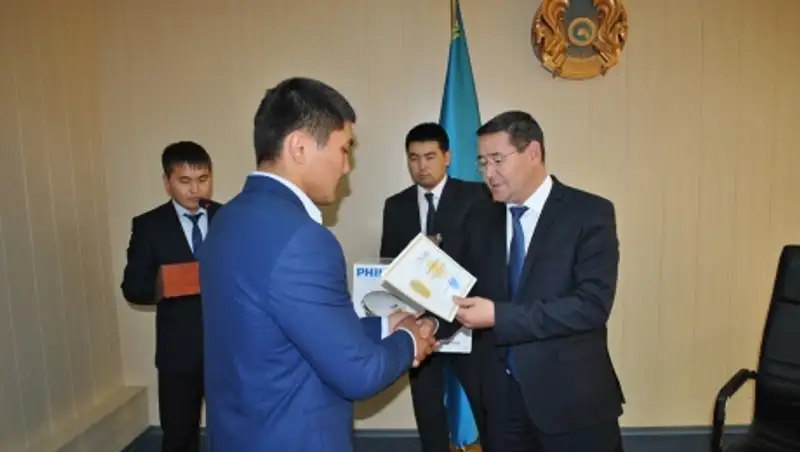 Аким Мунайлы поздравил также мастера спорта РК, чемпиона Азии по жиму штанги лежа Арслана Суюншалиева. Чемпионат Азии проходил в Омане.