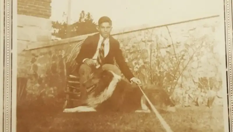 На пожелтевшей черно-белой фотографии, размещенной на форуме, запечатлен молодой человек с собакой. На первый взгляд, кажется, что он держит в руках селфи-палку, но это не так. По словам юзера John_Jard, его дед "управляет камерой с помощью веревки, привязанной к кнопке спуска".