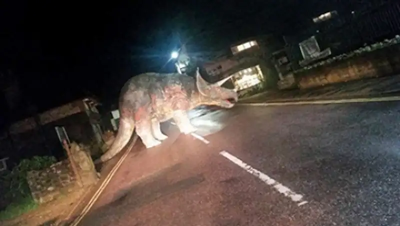 На острове Уайт в Великобритании неизвестные вынесли макет трицератопса из тематического парка Jurassic Garden при сувенирном магазине Island Gems и бросили его посередине одной из местных дорог.