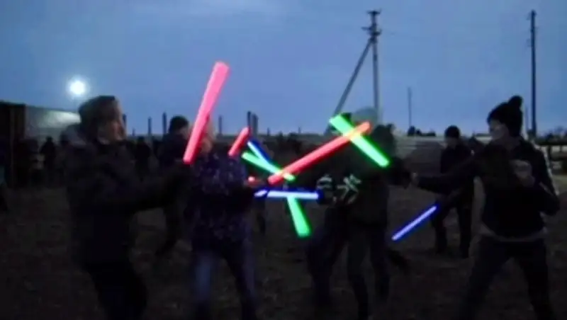 На конном дворе одного из крестьянских хозяйств развернулась настоящая битва. У участников рыцарского турнира были свои световые мечи, которые они сделали из подручных материалов. Для защитного обмундирования пригодились хоккейные доспехи. Правда, карагандинские фантасты расширили список персонажей шаманами и лошадьми. В своеобразном световом шоу приняли участие около 40 поклонников «Звездных войн».