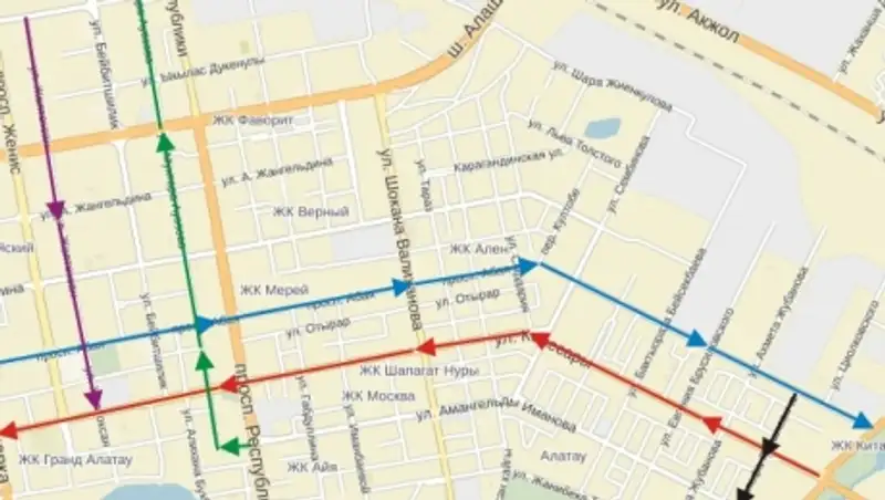 · ул. Ауезова (от пр. Республики до ул. А.Молдагуловой). Протяженность данного участка - 2,9 км;