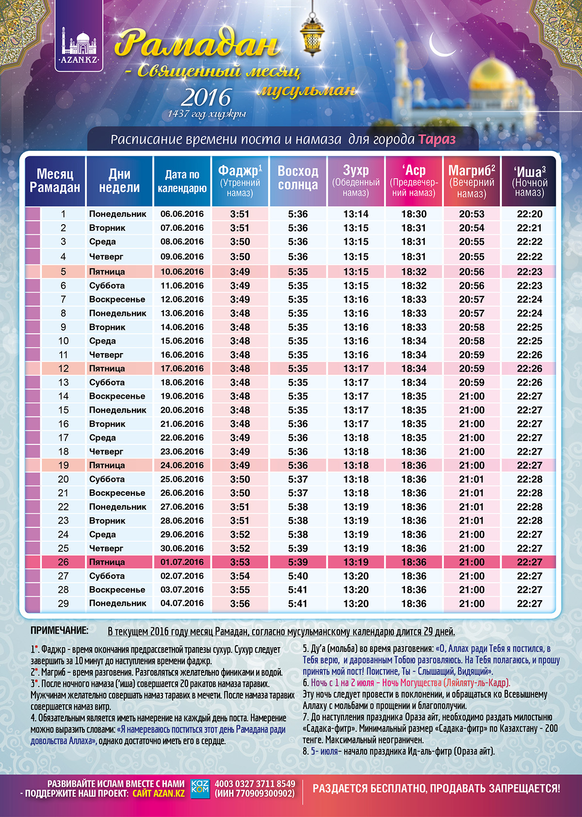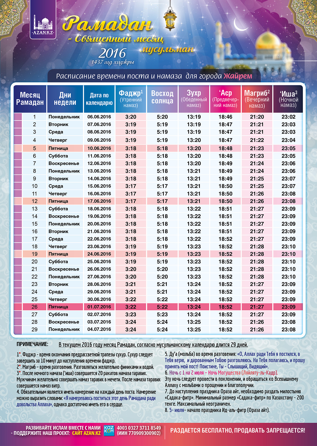 Как сообщает Администратор сайта www.azan.kz, это единственно правильное расписание, которое было опубликовано Духовным Управлением мусульман Казахстана 3 июня на сайте muftyat.kz.