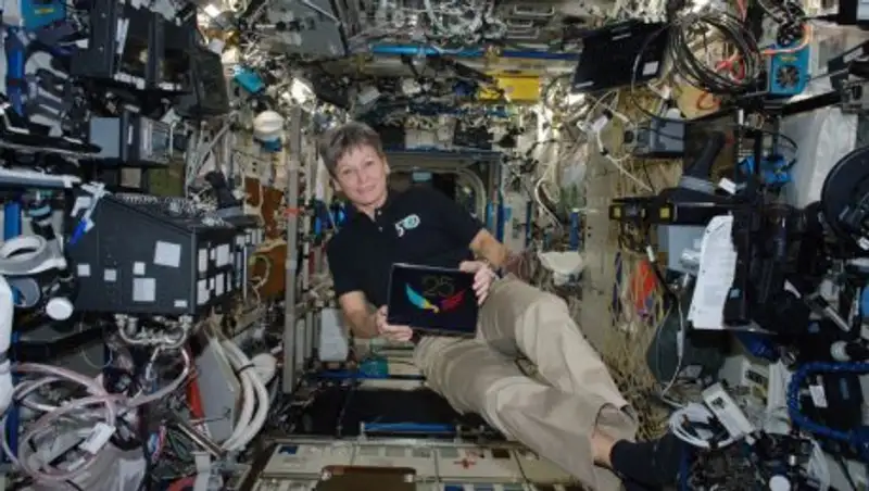 Бортинженер Пегги Уитсон подняла лого "25 лет вместе" на МКС.