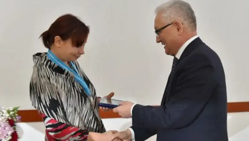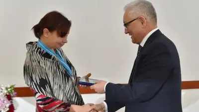 В ходе встречи аким области вручил подвеску «Күмiс алқа» Людмиле Абросимовой, родившей и воспитывающей шестерых детей.