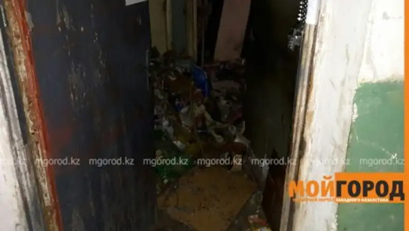 ТОО «Жайык Таза Кала» выделило грузовую машину для вывоза мусора. Волонтеры работают в специальных костюмах. В квартире очень трудно дышать, а по стенам бегают тараканы. Среди бытовых отходов в квартире лежат даже трупы кошек.