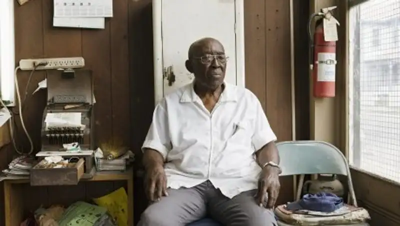 Владелец парикмахерской в Виргинии, США. На этом фото он сидит возле кассового аппарата старого образца.