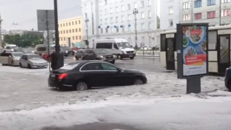 Выпавший град образовал сугробы в Петербурге, сообщает lenta.ru.