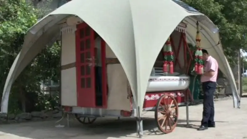 Шебер Еркінбек Бөкебаевтың қолынан шыққан бұл үшінші туынды. Ол осыған дейін жеміс-жидек пен көкөніс сатуға арналған жылжымалы дүңгіршек жасаған. Ал мына киіз үй пішіндес заманауи тіркемеге осы өңірге сапары кезінде Елбасы Нұрсұлтан Назарбаев та қызығушылық танытқан. Еркінбек Тәженұлы мұны жасауға 6 ай уақыт жұмсағанын айтады. Кейбір бөлшектерін шетелден тапсырыспен алдырған. Ұлттық өнер мен заманауи заттарды ұштастырған қолөнер шебері: «Арбаны инновациялық сауда нүктесі ретінде пайдалануға болады»,– дейді.