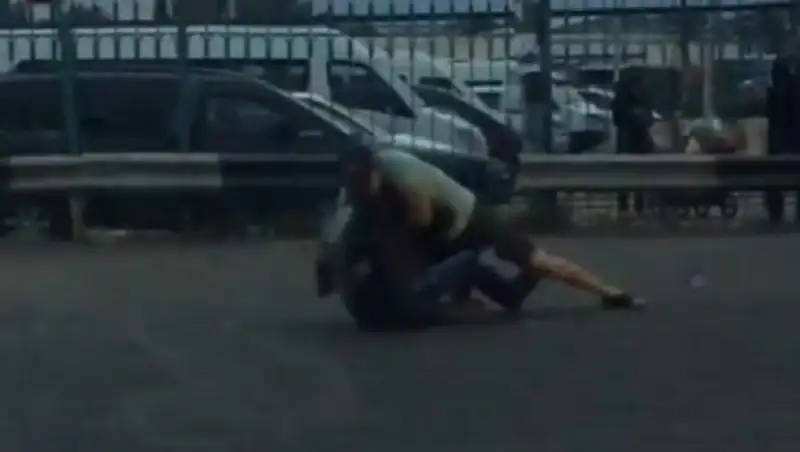 Видеоролик за 11 часов посмотрели более 64 тысяч раз. На видео видно, что двое мужчин дерутся прямо на проезжей части, рядом с ними находится сотрудник полиции, который регулирует движение.