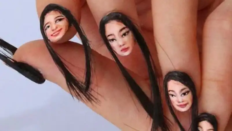 Изобрела это ужасающее нечто кореянка Даин Юн, которая прославилась в Instagram своими мейкап-иллюзиями (сейчас у нее почти 200 тыс. подписчиков). В этот раз она превзошла саму себя: она не только нарисовала свои крошечные портреты на всех пяти ногтях, но еще и наклеила на них волосы, чтобы сходство было просто поразительным.