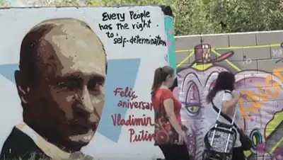 На граффити, появившемся в Барселоне, Путин изображен подмигивающим зрителям. Автор картинки оставил сообщение: "Каждый человек имеет право на самоопределение".