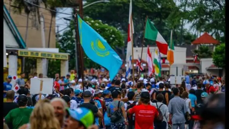 «Вчера прошёл парад Наций и впервые за 38 лет, был поднят наш казахстанский флаг здесь на Коне , чемпионате мира IRONMAN в Гавайи ! Тысячи спортсменов прошли по центральной улице Мекки Ironman, под приветствия ведущих , болельщиков и местных жителей .. Нам определили место между Японией и Мексикой , правда их было по 50-60 человек, а нас только трое???? Но мы пронесли наш флаг очень гордо !! " Ka-za-kis-tan . 3 athletes..!! " объявляли ведущие. И я счастлив, что мне выпала честь поднять наш флаг здесь, на другом конце земли, на таком значимом событии мирового масштаба !», - написал Рахимбаев в facebook.